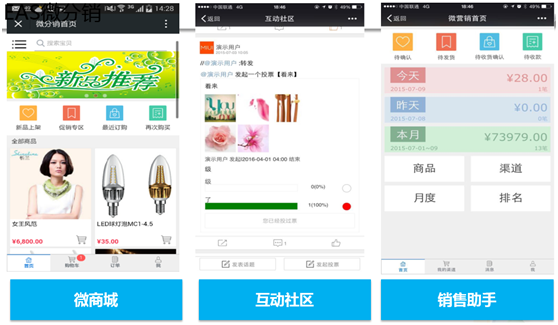 基于微信建立的企业微信商城,主要用于企业传统分销体系的转型。B2B解决方案,提供了基于层级结构的分销商订货、结算、物流配送、以及业绩统计与分析等等传统功能,同时还提供了如信用管理、库存管理、我的工作台等应用,同时后台应用支持商品管理、会员管理、促销管理、仓储配送等功能,提高客户运营的工作效率,降低企业运营成本。